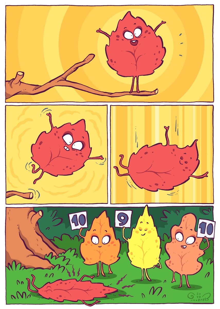 Ну что, первый месяц осени уже практически закончился, а значит впереди нас ждут еще более серые и дождливые деньки. Ну а в этом блоге вас ждет новая тематическая подборка! С наступлением каждого нового времени года я стараюсь делать соответствующие статьи и в этот раз я отобрал для вас семь отличных комиксов про осень. Надеюсь, что они смогут хотя бы немножко поднять вам настроение! Российский художник Евгений Яковлев является профессиональным комиксистом - за годы творческой карьеры он успел выпустить такие комиксы, как «Вольф Хельсинг», «Желуденок: большая прогулка» и многие другие. А еще Евгений регулярно рисует небольшие комиксы без слов - один из них, к примеру, как раз посвящен осени. Серия комиксов американского художника Райана Пагелова (Ryan Pagelow) под названием Buni («Бани») - это нескончаемый источник смешных сюжетов на все случаи жизни. Главный герой проекта - неунывающий кролик по имени Бани. Бани пытается жить свое обычной жизнью, но постоянно попадает во всякие забавн