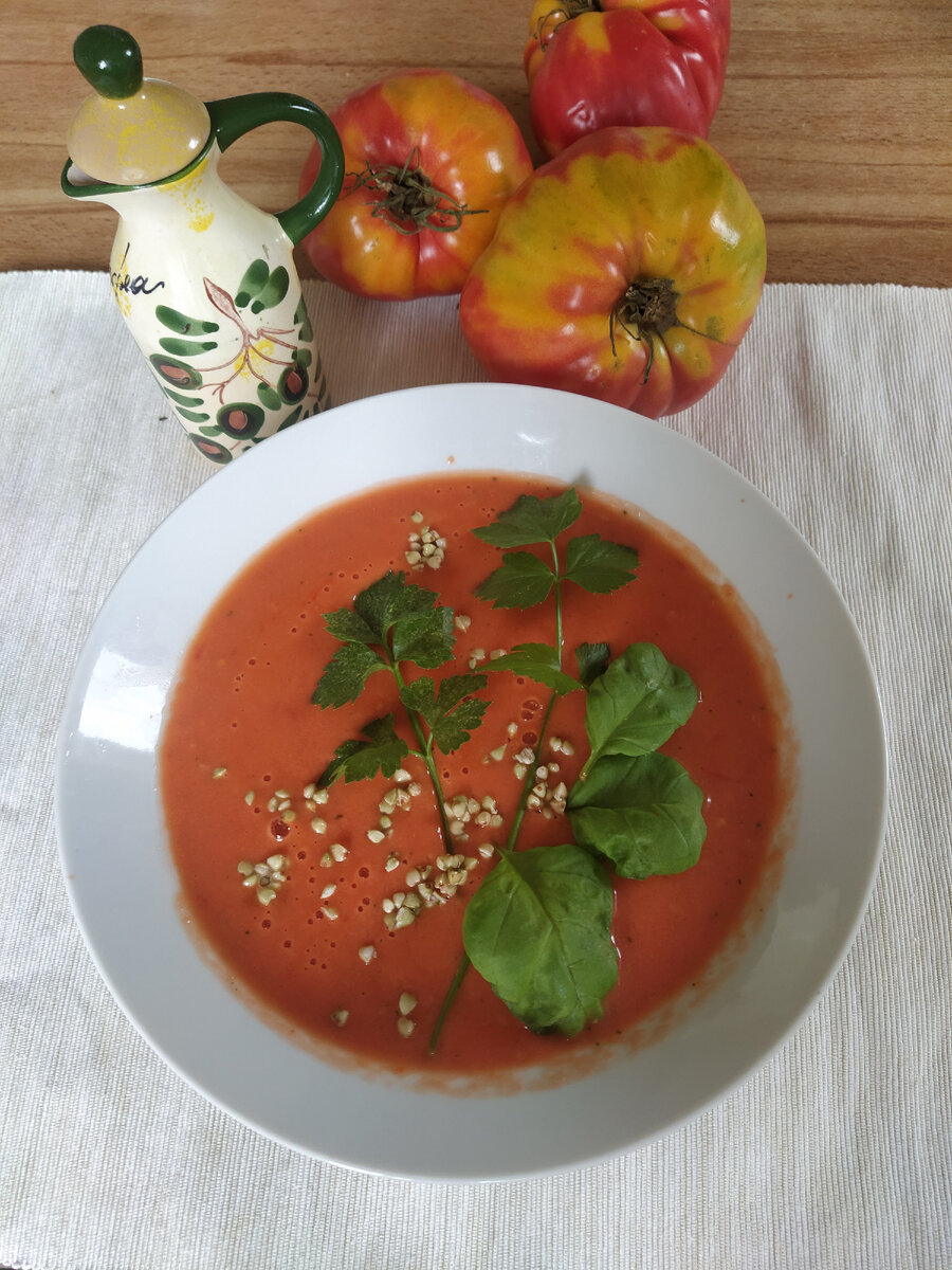 Все мы знаем, что самая полезная еда - это сырые овощи. Что именно их врачи рекомендуют включать в рацион до 70% от съеденного (!) И это довольно много. И тут как раз годятся рецепты сыроедческих блюд: полноценных завтраков, обедов и ужинов, целиком состоящих из свежих овощей. Привет, меня зовут Оксана! Я пишу про антиэйджинг, экоминимализм и здоровый образ жизни. Часто делюсь рецептами, которые помогают мне этот образ жизни поддерживать ) Суп гаспачо целиком состоит из свежих овощей и зелени. Он идеален для лета: лёгкий и сытный. А ещё он хорош в сезон помидоров: его можно готовить хоть каждый день, наслаждаясь вкусом и свежестью этих овощей, впитавших все летнее солнце. Подают гаспачо с багетом, но я предпочитаю ПП вариант и просто посыпаю его зелёной пророщенной гречкой. Итак, рецепт: 2 больших помидора 1 сладкий перец