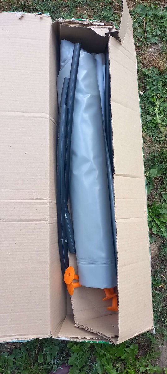 Лето в этом году в нашей полосе было очень жаркое. Поливали через день, а что-то и каждый день. У нас есть несколько емкостей для полива, но их объема стало не хватать из-за большого расхода воды. Пошерстив в Интернете, обнаружили, что сейчас есть складные емкости, которые можно легко привезти на дачу на своей машине и не платить за доставку. Посмотрели видео на ютубе про них и решили купить одну емкость на 300 литров на пробу. Пришла нам эта емкость, упакованная в длинную коробку. Вес около 3 кг. В коробке были опоры – ножки под бочку, трубки – перемычки для верха бочки и сама бочка. Сделана она из какого-то ПВХ материала, похожего на тот, из которого делают ПВХ лодки. Выглядит крепко. В инструкции написано, что выдерживает температуру до -50 (без воды естественно). Стали собирать по инструкции. Не скажу, что сборка сложная, но есть свои нюансы. Желтые ножки очень туго влезают в опоры - пришлось подстучать их молотком (предварительно подложив тряпку на них, чтобы не повредить).
