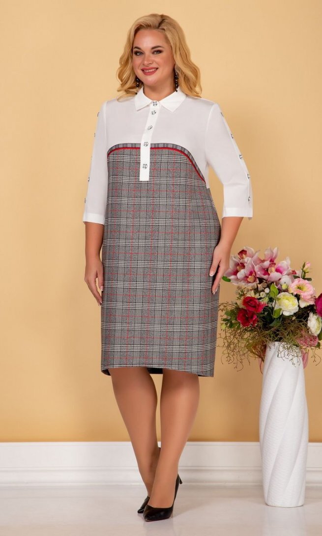 - Платье делового стиля, комбинированное. Верхняя часть – из белого креп-шифона, нижняя из костюмной ткани в клетку. Линия соединения – фигурная, украшена черно-красной тесьмой. Модель визуально стройнит и освежает за счет светлого верха.