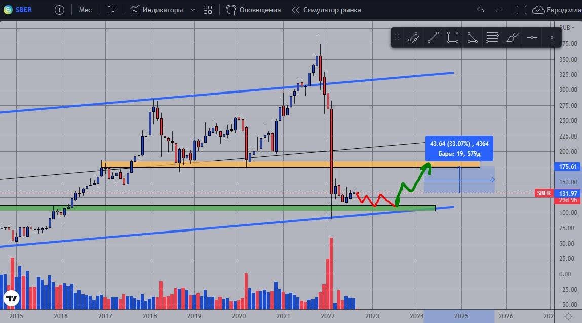 В Сбере отмечу скачок объемов – не большой, но все же. Определенная движуха начинается потихоньку. Напомню свой взгляд на Сбер. Думаю, что осенью можем увидеть от Сбера приятный сюрприз. Что-то вроде повторения ситуации с Газпромом. ❗️Только лишь первой целью будет уровень 175. От текущих цен потенциал = примерно +30% P.S. как и писал ранее цена у текущих уровней может совершать довольно неприятные и относительно глубокие колебания - стоит учитывать. В целом сценарий актуален, пока цена выше зеленой зоны. #SBER
