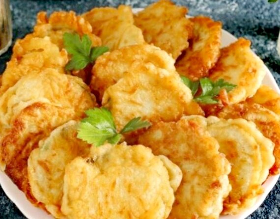 4. Кружочки баклажана обмакнуть в тесто и обжарить до золотистого цвета с двух сторон.