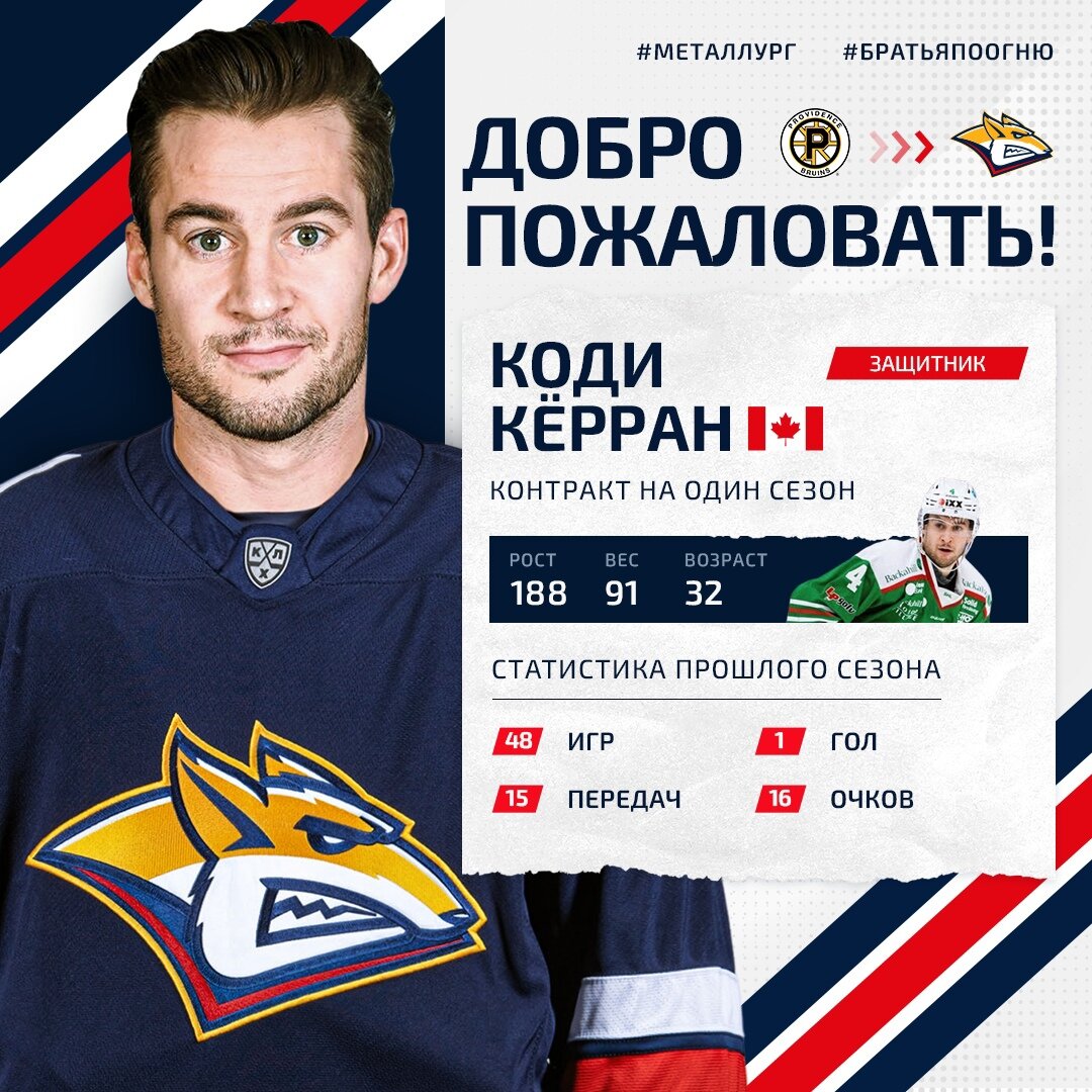 32-летний канадский защитник Коди Керран стал игроком "Металлурга". Соглашение между хоккеистом и клубом рассчитано до конца сезона-2022/23. Керран не принимал участие в минувшем сезоне Национальной Хоккейной лиги (НХЛ). Он являлся неограниченно свободным агентом. В АХЛ за фарм-клуб "Анахайма" канадский хоккеист провел 37 матчей и набрал 16 очков (1+15).