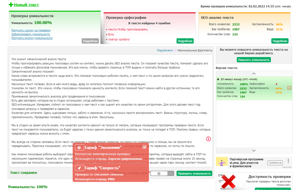 Проверяет уникальность строже, чем Text.ru. Не ясно, какие алгоритмы использует сервис, говорят, что это внутренняя разработка компании.