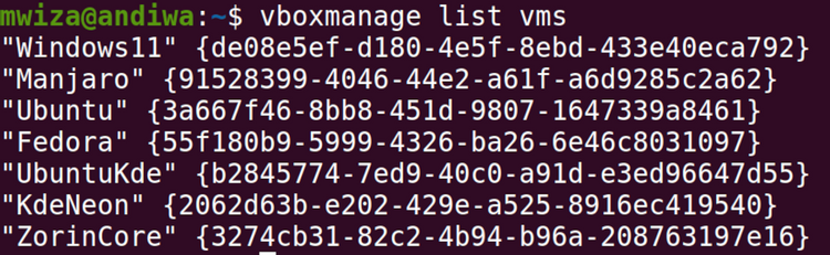 Здесь показано, как вы можете просмотреть список всех виртуальных машин, зарегистрированных на вашем ПК. Каждой виртуальной машине присваивается универсальный уникальный идентификатор, который используется для уникальной идентификации.