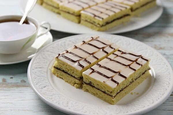 Приготовить песочное тѣсто, раскатать его не особенно толсто, и навертѣвъ на скалку, положить и развернуть во весь пирожный листъ, сдѣлать четырехугольникомъ, лишнее тѣсто с краевъ обрезать, и посадить въ печь, когда появится легкiй колеръ, вынуть изъ печки и дать остыть. Затѣмъ сверху смазать жидкимъ сладкимъ сиропомъ или просто сладкой водой и поставить въ печь подогрѣть; вынувъ изъ печки, разрѣзать вдоль на полоски, шириною въ два вершка, и каждые двѣ полоски склеить, намазавъ ихъ сѣмечкомъ малины. Потомъ каждую полоску заглазировать бѣлой помадкой тонко (заглазировать значитъ облить помадкой, размазать по всей полоски и снять ножемъ лишнее, чтобы не было толсто). Когда заглазировано, дать немного пообсохнуть, а затѣмъ нарѣзать порцiонно и подавать къ чаю или къ обѣду на сладкое.