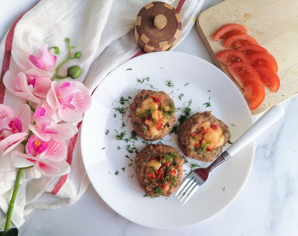 Ну и смотрится оно достаточно празднично, поэтому его можно готовить не только на обед или ужин, но и на праздничный стол. 5. Помидоры и сыр нарезать небольшими кубиками. 6. Обжаренные котлеты переложить в форму для запекания, заполнить углубления начинкой. Запекать 25 минут в предварительно разогретой до 180 градусов духовке. Приятного аппетита! Ингредиенты: 0,5 кг фарша (я брала из индейки) 1 яйцо 100 г сыра 60 г черствого батона молоко 2 небольших помидора 0,5 ч. л. сушеного базилика По вкусу соль и перец растительное масло для жарки