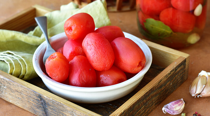 Есть немало любителей надкусить кожицу и со смаком втянуть вкусный помидорный сок и нежную мякоть. Помидоры, консервированные без кожицы, как раз для тех, кто категорически ее не любит и оставляет на краю тарелки. Если воспитание вам этого не позволяет перед тем, как закладывать помидоры в банки, кожицу можно снять. Маринад можно приготовить с водой или томатным соком. ИНГРЕДИЕНТЫ: 600 г помидоров 15 г соли 8 г сахара 2 зубчика чеснока 1,5 ст. ложки 9% уксуса 200–220 мл воды 2–3 шт. черного перца 2 шт. душистого перца 1 бутон гвоздики лист хрена по вкусу эстрагон (тархун) по вкусу листья сельдерея по вкусу зонтик укропа по вкусу листья вишни по вкусу листья смородины по вкусу ПОШАГОВОЕ приготовление