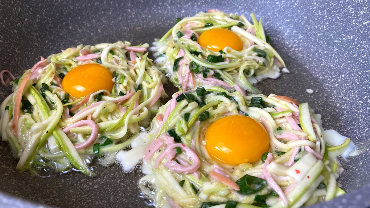 Кабачковыми оладушками никого не удивишь. Тем более когда под конец сезона ими уже вдоволь наелся. Сегодня хочу поделиться рецептом кабачковых гнездышек, состав которых можно менять в зависимости от того, что есть у вас в холодильнике и на сколько сытными хотите их приготовить. В конце статьи делюсь вариантами из чего и с чем их можно приготовить. Гнезда получаются невероятно нежными и легкими, поэтому идеально подходят для завтрака. Вот как готовим: У кабачка* удаляем плодоножку. Дальше можно натереть его на терке для моркови по-корейски или порезать тонкой соломкой, как показано на фото. БОльшую часть кабачка я натерла на терке. Так соломка получается ровной и аккуратной. Следующий шаг — зеленый лук. Если вы готовите перед работой, то можно лук заменить на укроп или любую другую зелень, а можно вовсе пропустить этот шаг. Затем для того, чтобы сделать гнезда сытными, на терке для моркови по-корейски натираем пару сосисок*. В миску добавляем муку, соль и перец по вкусу. Затем аккуратно