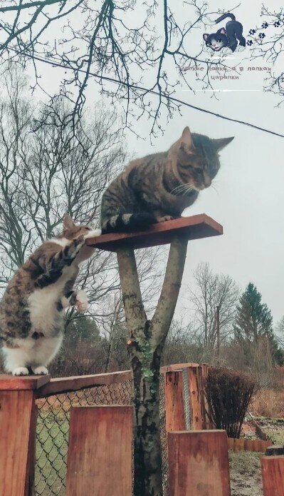 В сырую грязную погоду, даже кискам становится грустно и тоскливо! Бегать по улице не хочется, лапки мочить. В такие моменты те котики и кошечки, которые постоянно сидят дома, и не выходят никогда на улицу, предпочитают тихо грустить на окошке, глядя на неприглядную атмосферу снаружи. Моим же разбойникам всегда необходимо быть на улице, даже если там начнется ураган или метель. Но несмотря на все их капризы, мочить лапочки все - таки им не хочется, и тогда они взбираются на забор и сидят там. Места там для всех мало, а посидеть хочется всем. И тогда я решила сделать им новое развлечение, чтобы сидеть было удобно, и места хватало всем сразу. Сооружение это делается легко, просто и быстро. Итак, нам понадобится: 1. Бензопила. 2. Доска. 3. Молоток. 4. Шурупы или гвозди (на ваш выбор). 5. Часть ветвистого дерева. А теперь более подробно. Берем бензопилу идём искать подходящее дерево. Выбираем такое, чтобы все сучья находились с разных сторон от ствола, и напоминали спиральную лестниц