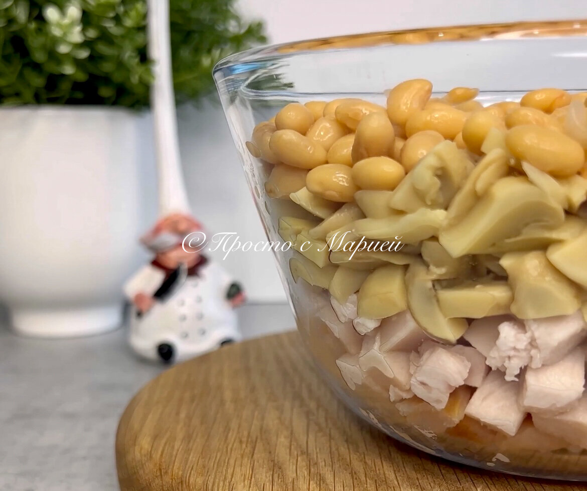 К вам идут нежданные гости? Пусть идут, а вы угостите их салатом, который готовится быстрее некуда: 10 минут и он уже на столе! Привет, друзья! Вы на канале "Просто с Марией", и сегодня я хочу поделиться с вами простым рецептом вкусного салата на скорую руку. В составе минимальный набор продуктов, которые можно купить в любом сетевом магазине. Ничего экзотического, но получается вкусно. Салат ароматный, очень сытный и по-настоящему быстрый — не на словах, а на деле. Если вдруг ещё не готовили, настоятельно рекомендую попробовать. Приступаем к приготовлению. Копчёную куриную грудку нарезаем кубиками небольшого размера. Салат также можно готовить и с обжаренной и с запечённой курицей. Это дольше по времени, но тоже вкусно. С обычной отварной совсем не то получается! Открываем баночку белой консервированной фасоли, откидываем на дуршлаг и хорошенько промываем. Даём немного обсохнуть и перекладываем в салатник к грудке. Следом добавляем стерилизованные резаные шампиньоны. Это консерв