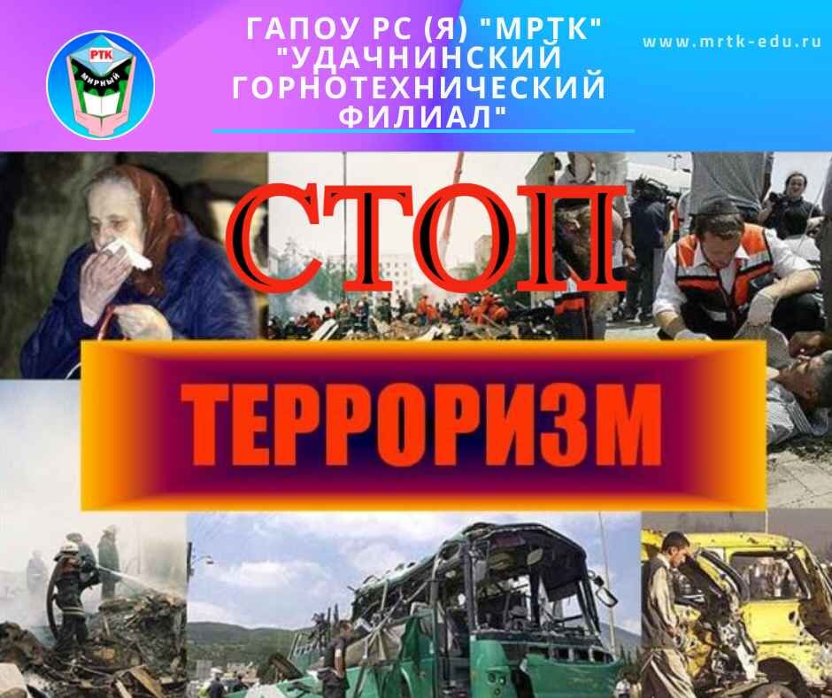 «Удачнинский горнотехнический филиал»: «Мир против террора!». 3 сентября 2022 года обучающиеся 1 курса «Удачнинского горнотехнического филиала» МРТК приняли участие в мероприятии, посвященном Дню борьбы против терроризма, организованного библиотекарем городской детской библиотеки № 3 города Удачного Светланой Ломакиной. День солидарности в борьбе с терроризмом отмечается в честь памяти о людях, погибших в одной из школ города Беслан во время террористического захвата в 2004 году. Мир подвергается постоянным террористическим атакам, но самым циничным актом является захват террористами школы в Беслане. Ведущая рассказала немного о событиях тех страшных дней. Обучающиеся, просмотрев социальные видеоролики, узнали о трех днях ада, о мучениях и издевательствах, которым подвергались заложники ужасной трагедии, о героизме простых людей, отваге и мужества бойцов спецназа, противостоявших террористам, о страхе детей. Так же вспомнили террористические акты в Москве, Санкт-Петербурге и др., кото