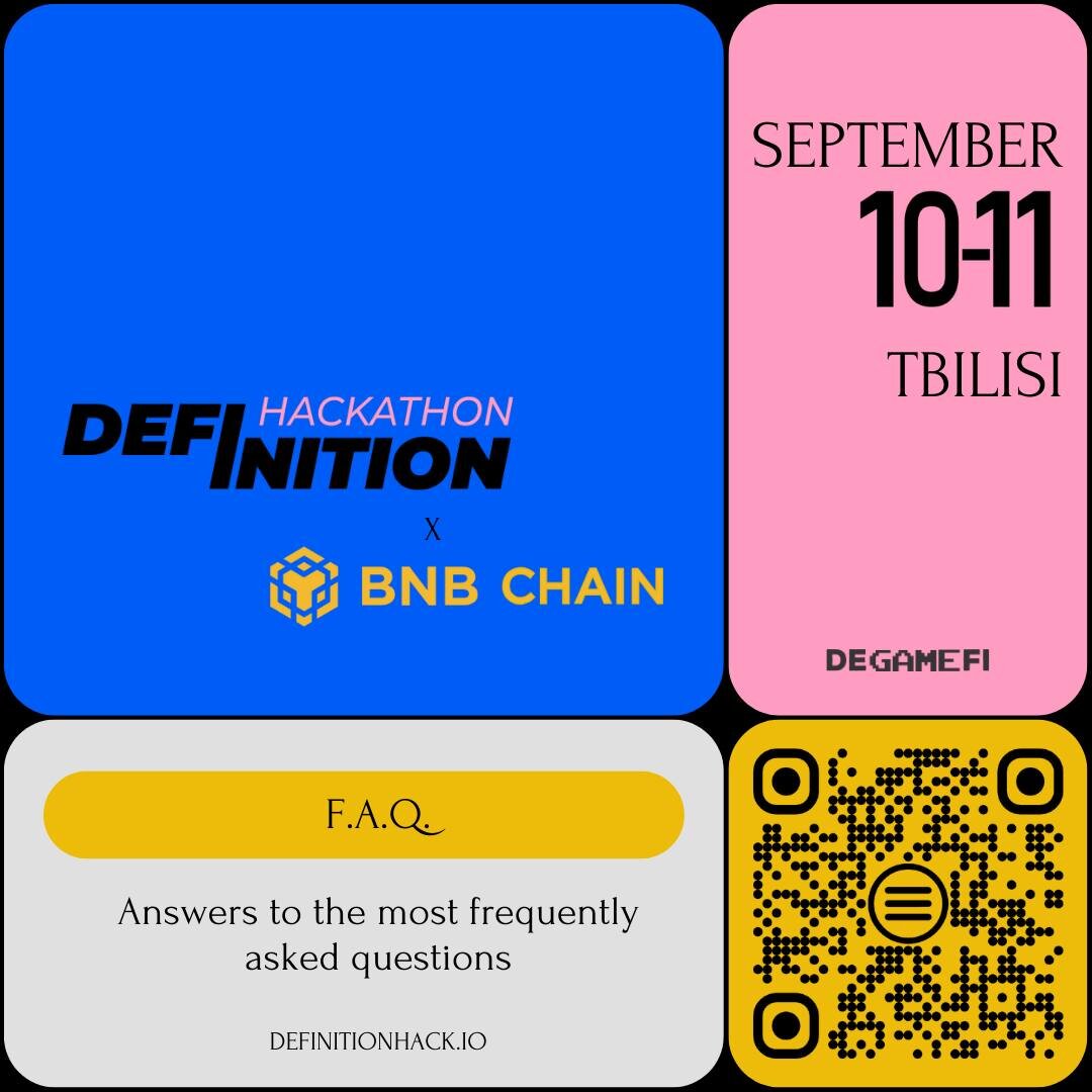 Hi all! Since the start of registration, our team has been getting quite a lot of questions related to the upcoming Definition x BNB Chain hackathon. ⁉️ We decided to make a Q&A post with answers to the most frequently asked questions: Q: Is registration for the hackathon open? A: Yes, it is! You can see all the necessary information on our website. Registration link. Q: Can I register as a team? A: Yes, of course! Our registration form has two forms: one for teams and one for individuals. In case of registering with an existing team, the team captain must fill out the appropriate form, after which a representative of the organizer will contact you to further clarify all necessary details. Q: Can I register if I have NO team? A: Yes, of course! As we said earlier, our registration form has a form, in addition to the team form, for registering individual participants! Our team will contact you after receiving such an application and will try to help you create a team from those partici