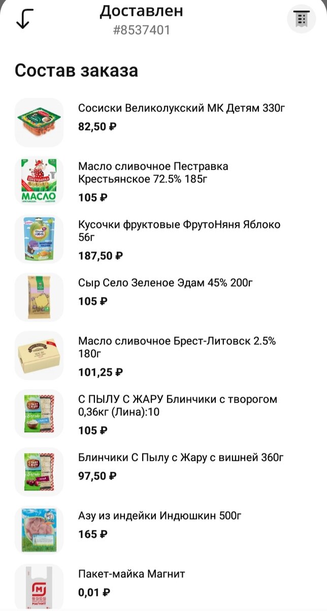 Всем привет. Потихоньку начинаю отходить от болезни, домашние вроде в норме, надеюсь уже не зацепит никого 🙏 В четверг муж ходил снимать гипс, сняли, врач глянул на ногу-отекшая, надели обратно🤣 Ещё неделю сказали носить, и будут снимать. Я ходила в пятницу на прием к врачу, это было приключение, скажу я вам) Отвечает, заразная, но 7 дней и на выписку, если жалоб нет🤦♀️ Вы же говорит ещё таблетки допиваете. Какие таблетки? Ну которые вам принесли. 🤔Ничего, говорю мне не принесли! Кое-как упросила ещё 2 дня дать, это жесть! Ни осмотра, ничего, даже сатурацию не мерили. Это вот новости по нашим болячкам) А теперь к интересному, опробовали Магнит - доставку, для первого заказа был промокод на скидку 25% Долго, около недели вообще не заказывалось ничего, писало оплата не возможна и вот наконец заработало! Со скидками вышло даже неплохо! Фруктовых кусочков там 2 шт, остальное по 1 шт. Доставили за 30 минут, удобно. Вердикт: пользоваться можно! Особенно со скидкой) Пока за