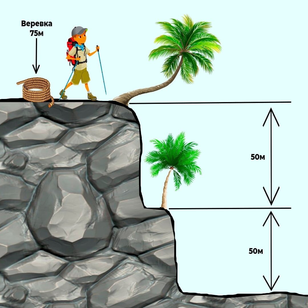 ❗️Данную задачу использовали на собеседование в Apple и Samsung. 🧗♂️Альпинист находится на скале высотой 100 метров. Посредине скалы на высоте 50 метров растет дерево. У альпиниста из снаряжения есть веревка длиной 75 метров и нож. Как ему спуститься со скалы? Ответ пишите в комментариях! ❗