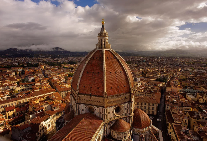 Ранняя постройка Брунеллески — купол собора Санта-Мария деть Фьоре во Флоренции; это образец блестящего пластического (пространственного) и инженерного решения. Брунеллески предстояло перекрыть без возведения лесов огромный пролёт купола (диаметр основания сорок два метра). Зодчий изобрёл необычайно сложную для своего времени конструкцию: лёгкий пустотелый купол имел двойную оболочку и каркас из восьми рёбер, который опоясывали кольца. Грандиозный купол, покрытый тёмно-красной черепицей, связанный крепкими белыми рёбрами и увенчанный изящным беломраморным световым фонарём, торжественно парит над городом как величественный образ Флоренции. Великий итальянский архитектор Леон Баттиста Альберти, посвящая Брунеллески свой трактат о живописи, писал, что это «великое... вздымающееся к небесам сооружение осеняет собой все тосканские земли». Творение Брунеллески — предшественник многочисленных купольных храмов в Италии и других странах Европы.