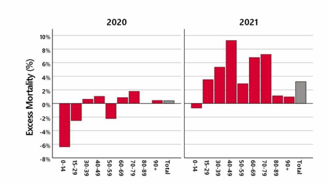 «В 2020 году наблюдаемое число смертей было близко к ожидаемому числу с учетом эмпирического стандартного отклонения. Напротив, в 2021 году наблюдаемое число смертей было на два эмпирических стандартных отклонения выше ожидаемого. Высокая избыточная смертность в 2021 году была почти полностью обусловлена увеличением числа смертей взрослых людей и начала накапливаться с апреля 2021 года. Аналогичная картина смертности наблюдалась и для мертворождений с увеличением примерно на 11 процентов во втором квартале 2021 года. Похоже, в апреле 2021 года произошло что-то, что привело к внезапному и устойчивому росту смертности в возрастных группах до 80 лет, хотя до сих пор такого влияния на смертность не наблюдалось даже во время пандемии Covid-19» (источник: https://www.researchgate.net/publication/362777743_Excess_mortality_in_Germany_2020-2022)