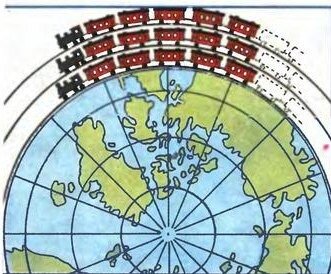 Представьте себе проложенный вдоль экватора непрерывный железнодорожный путь, по которому движется столь же «закольцованный» поезд с совсем не космической скоростью, скажем, 100 км/ч. По крышам вагонов этого поезда проложен ещё один непрерывный путь, по коему в ту же сторону едет ещё один поезд с той же скоростью 100 км/ч относительно пути и уже 200 км/ч относительно поверхности планеты! Если продолжать дальше