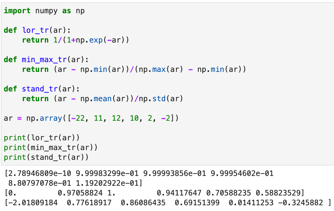 Различные алгоритмы машинного обучения для более эффективной обработки данных нуждаются в приведении к их определенному диапазону, например, от 0 до 1. Способы такой обработки включают использование логистической функции, шкалирование по минимаксу, стандартизацию. Для лучшего понимания, рассмотрим как они задаются вручную и сравним с результатами готовых способов. Ниже перечисленные преобразования в том же порядке заданы в функциях: Выше выведены результаты применения преобразований к заданному массиву. А теперь используем функцию expit из модуля scipy.special для сравнения с нашей lor_tr: Вот аналог действий min_max_tr с помощью MinMaxScaler из модуля sklearn.preprocessing: Для стандартного шкалирования класс находится рядышком с MinMaxScaler и называется StandardScaler: