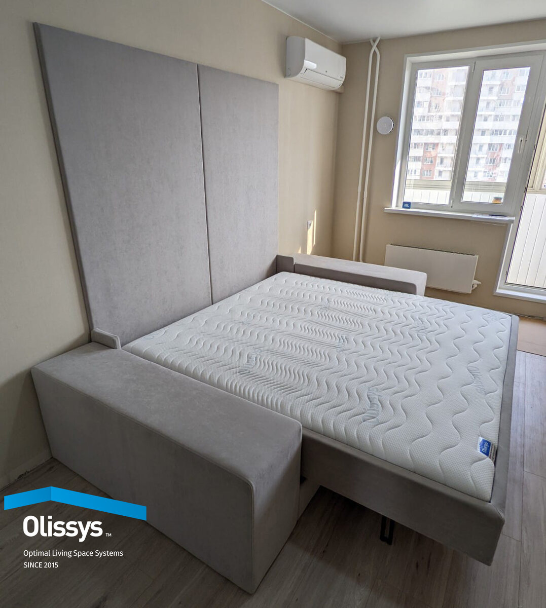 С первого взгляда может показаться, что эти фото черно-белые. Но на самом деле, это великолепное сочетание монохромных оттенков модуля-трансформера, пола и стен комнаты. Вместе они создают уютный, спокойный интерьер. Для своей комнаты наш заказчик выбрал модуль-трансформер серии Olissys 2.0 Classic. Что уникального в конструкции: ✔️Здесь мы видим совершенно непривычный для этой модели диван с широкими подлокотниками, без ножек ✔️Вместо классических фасадов из ЛДСП, здесь использованы тканевые — в тон дивана. Завершает композицию мягкое тканевое изголовье. Материал обивки — бархатистый микровелюр из коллекции Bavaro, оттенок №20. ✔️Наши заказчики выбрали максимальную ширину кровати — 180 см. При желании, ее можно уменьшить до 160 см и 140 см. Стоимость изделия при этом так же изменится. ✔️Благодаря нестандартному дивану, матрас находится в глубоком отсеке с мягкими бортами. Очень удобно заправлять простынь и приводить кровать в вертикальное положение. Ничего не сползет! Габариты констр