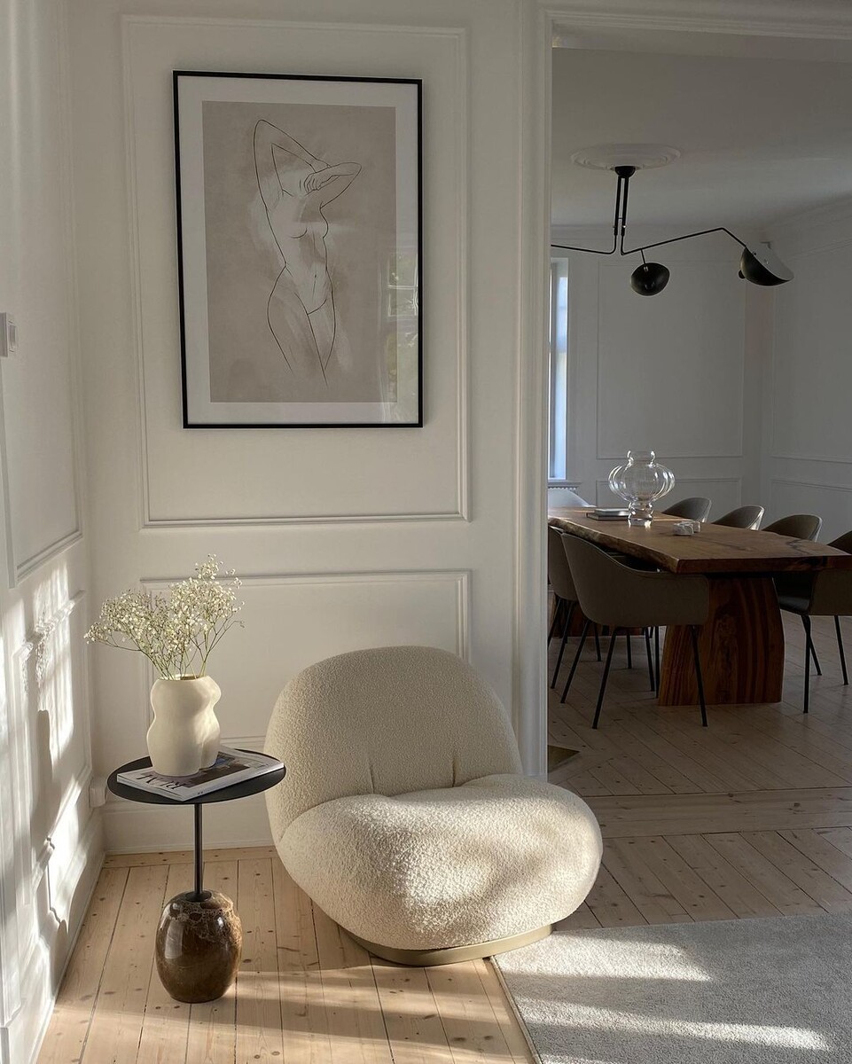 Если вы в поисках интересных акцентных деталей для классической гостиной, то наша подборка для вас. Мы нашли несколько интересных предметов мебели, которые помогут задать настроение. 1. Кресло Конечно, первое, что бросается на этой фотографии в глаза — это кресло необычной формы, которое прекрасно смотрится на фоне декорированных классической лепниной стен. Кресто можно приобрести на сайте designporn.ru, примерная стоимость 98 500 руб. 2. Столик Необычное кресло дополняет необычный столик. Круглая столешница закреплена на тонкой ножке, а основание напоминает больше вазу или скульптуру, чем ножку стола. Мы не нашли такой же столик, но упрощенную модель с такими же необычными пропорциями можно приобрести на aliexpress. Стоимость столика составляет 17 758 руб. 3. Ваза Декор играет далеко не последнюю роль в данной композиции. На столике интерпретация классического сюжета — афродиты. Конечно, выбор таких элементов декора это обычно длительный процесс поиска «того самого» предмета. Но, если