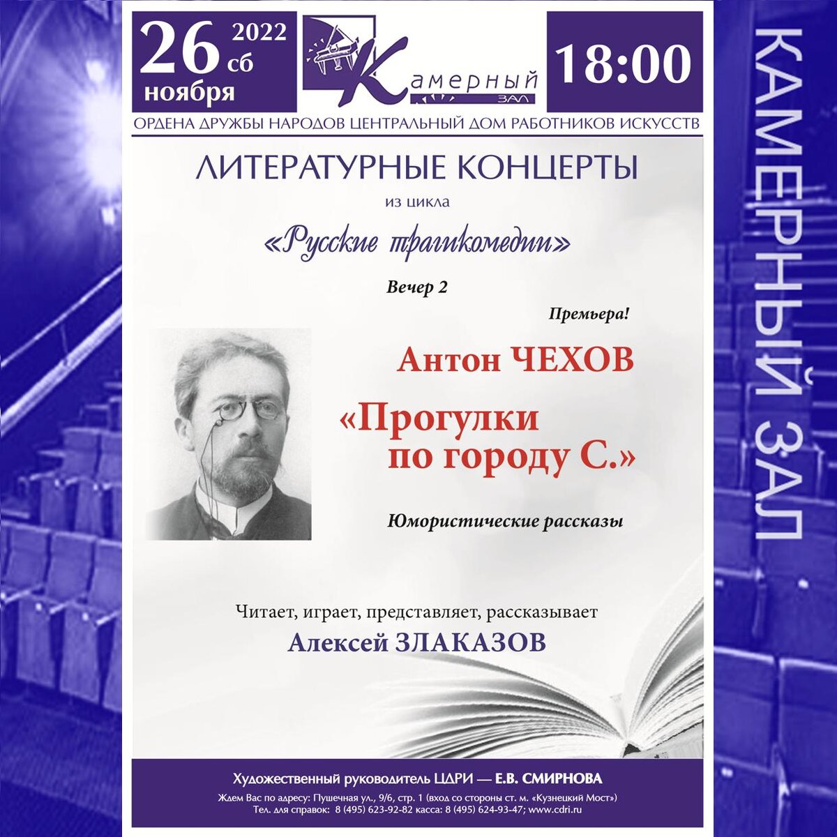 Литературные концерты из цикла «Русские трагикомедии» Антон Павлович Чехов (29 января 1860 — 15 июля 1904) — русский писатель, прозаик, драматург, публицист, врач, общественный деятель в сфере благотворительности. Классик мировой литературы. Почётный академик Императорской академии наук по разряду изящной словесности. Один из самых известных драматургов мира. Его произведения переведены более чем на сто языков. Его пьесы, в особенности «Чайка», «Три сестры» и «Вишнёвый сад», на протяжении более ста лет ставятся во многих театрах мира. За 25 лет творчества Чехов создал более пятисот различных произведений (коротких юмористических рассказов, серьёзных повестей, пьес), многие из которых стали классикой мировой литературы. Помимо литературной и врачебной работы Чехов придавал огромное значение благотворительной деятельности в сфере помощи голодающим, детям, крестьянам, туберкулёзным больным, Организовывал сборы средств в пользу нуждающихся и регулярно