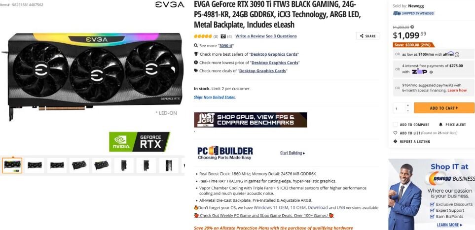 Напомним, официальная стоимость GeForce RTX 3090 Ti – 2000 долларов, но сейчас видеокарту реально купить за 1100 долларов. Причем речь о не самой заурядной модели EVGA GeForce RTX 3090 Ti FTW3 Black Gaming.