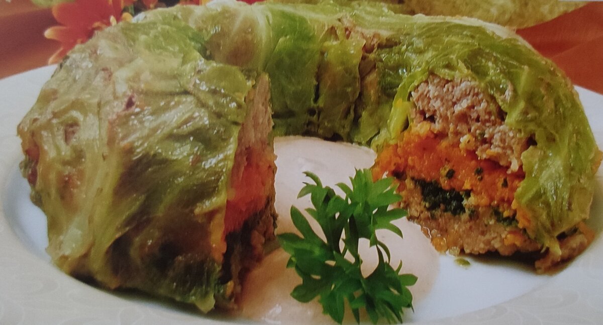 - Приготовление: Снимите с капусты верхние листья, вырежьте кочерыжку. Варите 10 минут в подсоленной воде. Достаньте, охладите и разберите на листья, свежие утолщенные части. Смажьте кольцевую форму сливочным маслом и уложите листья капусты черешками вверх так, чтобы один заходил на другой.