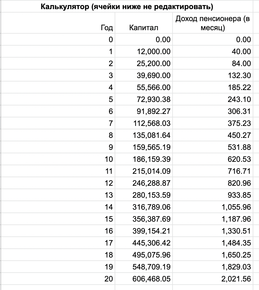 В наши дни любой банк возвращает часть денег за покупки по карте. Некоторые банки предлагают инвестировать кэшбек в биржевые фонды. Давайте разберемся, сколько можно накопить, инвестируя cashback в надежные финансовые инструменты. И на какую прибавку к пенсии стоит рассчитывать через 20 лет таких инвестиций. Предположим, что Считаем В одной из предыдущих статей давал ссылку на калькулятор пассивного дохода. Хотите посчитать сколько откладывать чтобы выйти на пенсию через 20 лет и жить на пассивный доход, читайте статью ниже. Чтобы посчитать какой накопится кэшбек и какую он даст нам прибавку к пенсии, сделал калькулятор расчета дохода инвестиций кэшбека. В параметры калькулятора забил рост дохода - 10% и доходность капитала 5% Обратите внимание, калькулятор доходности учитывает инфляцию. Показывает суммы в пересчете на сегодняшний курс! За 20 лет инвестиций можно накопить 606 000 рублей по текущей покупательской способности и текущим ценам. Или 2 021 рубль ежемесячной прибавки к пенси