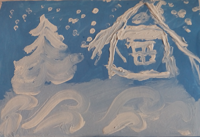 Старушка поманила их и пошла в сторону. Через несколько минут они вышли к маленькой избушке. Стены и крыша были засыпаны снегом. Лишь узенькая расчищенная тропинка среди сугробов вела к двери. Старушка открыла дверь и позвала детей скорее заходить.