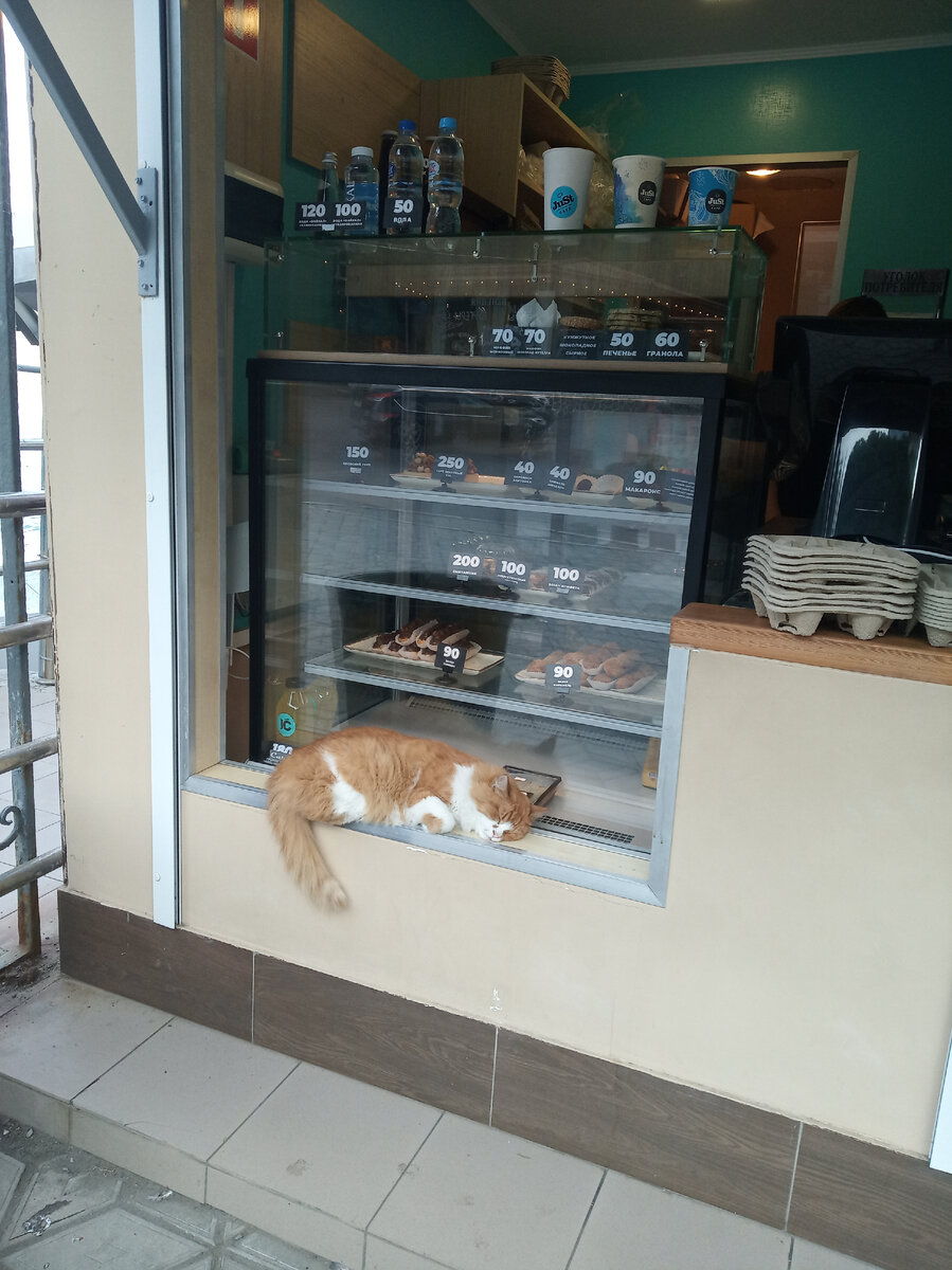 Этот рыжий устроился под прилавком. Потом увидели его изображение на штендере с меню ресторана над морем.