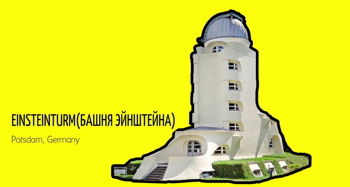 "Башня Эйнштейна" в Потсдаме - астрофизическая лаборатория, созданная на средства меценатов и ученых и названная в честь всемирно известного физика. Яркий пример архитектурного экспрессионизма и органической архитектуры был придуман крупнейшим представителем этого течения в архитектуре модернизма, немецким мастером Эрихом Мендельсоном в конце Первой мировой войны (над проектом с ним работал также молодой Рихард Нойтра). О долгих поисках окончательного варианта свидетельствуют сохранившиеся многочисленные эскизы, выполненные архитектором. Строительство объекта велось в 1919-22 годах, а длительный процесс установки оборудования завершился в 1924 году. Солнечный телескоп, установленный на башне, улавливает свет и через специальные отражатели спускает его вниз, в лабораторию на первом этаже, где свет разлагается на спектры и исследуется.