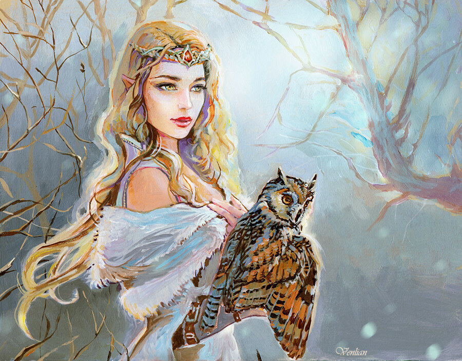 И на плече её сидит большая птица.