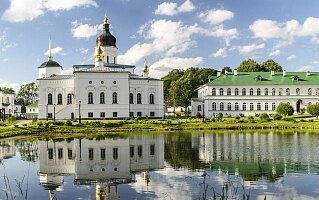 Это древняя северная обитель основана преподобным Евфросином, Псковским чудотворцем. По монастырскому преданию, крестьянин Елеазар из села Виделибье заинтересовался тем, что в разных церквах Пскова богослужения проходят по-разному. Для выяснения истины он отправился пешком в Константинополь, но и там не нашел единства. Вернувшись в Псков, поступил в Снетогорский монастырь и принял постриг с именем Евфросин. В 1425 году отпросился на уединение на Толвское озеро, в пустынные леса. В 1447 году построил здесь на вершине холма деревянную церковь во имя Трех Святителей – Василия Великого, Иоанна Златоуста, Григория Богослова. После кончины преподобного в 1481 году деревянная церковь стала кладбищенской, а монастырь начал отстраиваться чуть ниже по склону, где была возведена новая каменная Трехсвятительская церковь.
