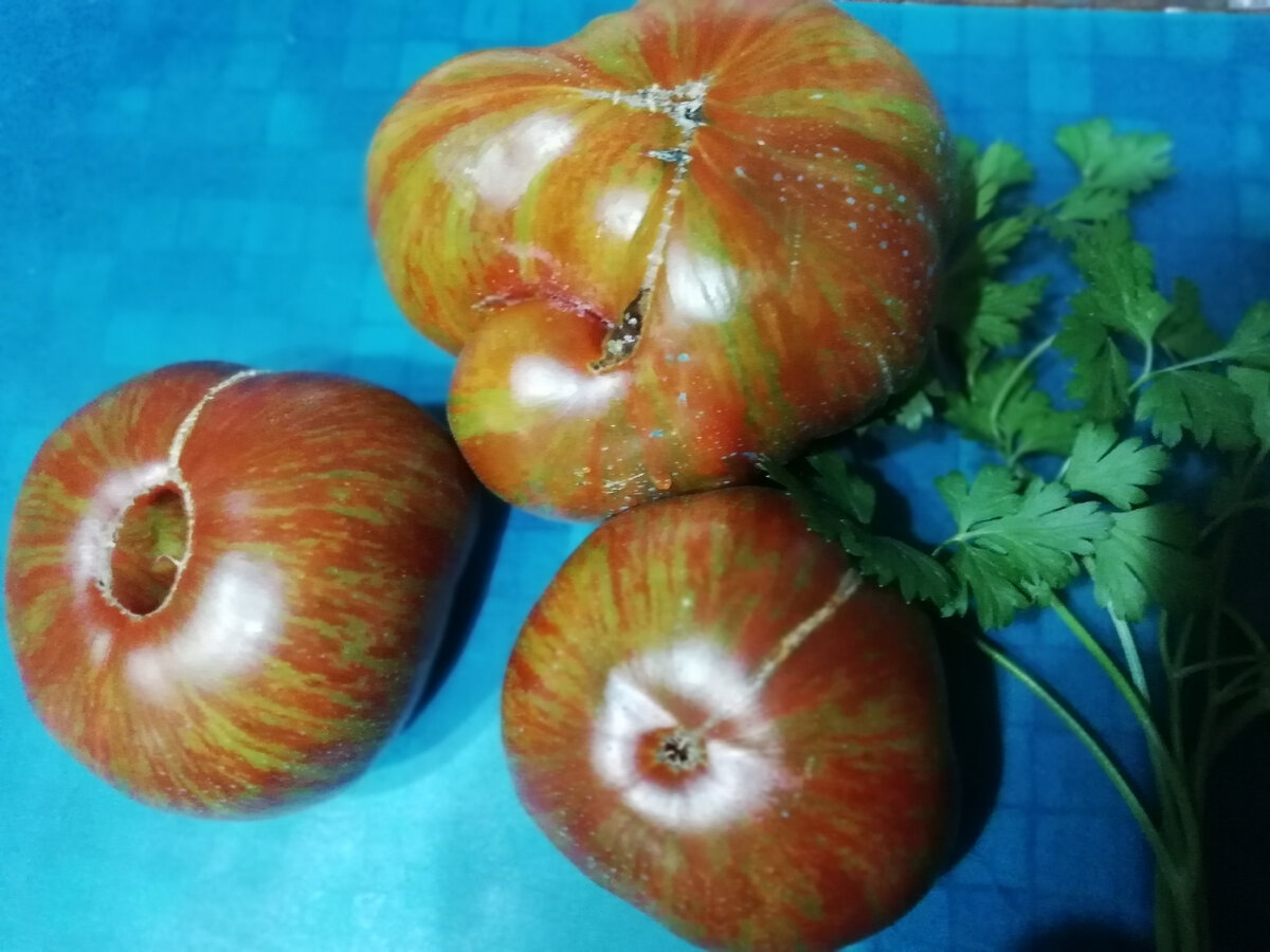 Сорт является более урожайной версией "Беркли тай дай хаат". Оригинатор сорта Брэд Гейтс. Сорт среднеспелый, высокорослый. Плоды крупные, вес от 250 до 400 грамм, немного приплюснутые, округлые. Окраска плодов очень красивая: сам помидор темно-оливкового цвета, по всему томату тёмно-бордовые и ярко-красные штрихи, полоски. Плоды мясистые, сладкие, с насыщенным гармоничным вкусом. . На разрезе мякоть трехцветная. Использовать для свежего потребления, получится очень хороший сок, соус.