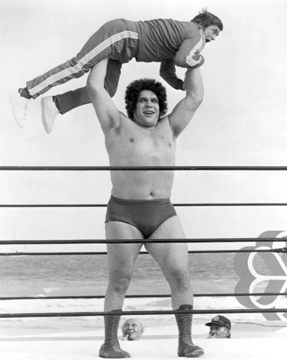 Он же просто Андре Рене Русимов. И сегодняшняя фотоподборка посвящена культовому французскому рестлеру ростом 224 сантиметров и весом в 236 килограмм. Согласитесь, фигура весьма внушительная?! Лично я, честно говоря, ничего не смыслю в рестлинге, но физические данные у парня были, конечно, за гранью разумного. И виной тому гигантизм, вызванный избытком гормона роста. Родился он во Франции в семье болгарско-польских иммигрантов. Но прославился буквально на весь мир. Сначала Европа, потом Япония, а потом Канада и США. Кстати, Андре Гигант, как его стали называть фанаты, стал первым членом Зала Славы WWF. Кроме этого, Русимов был упомянут в Книге рекордов Гиннесса 1974 года, как самый высокооплачиваемый рестлер в истории на тот момент. При этом, как вспоминали его друзья и знакомые, это был мягкий, добрый и очень щедрый человек. Также слыл известным любителем горячительных напитков. По свидетельствам друзей, за вечер выпивал не менее сотни бутылок пенного. Правда, иногда после такого пад