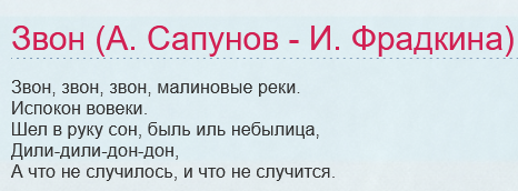 Тут надо разобраться с автором стихов, это очень важно. Переписала с экрана, что это И. Фрадкина (?), и в интернете такое есть, но я-то помню, что это стихи Александра Слизунова. Кто прав?