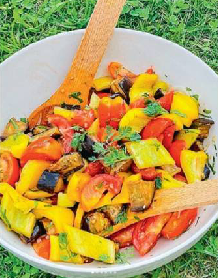 Ингредиенты которые понадобятся для приготовления салата Светофор: Готовить: Баклажан нарезать пластинами, подсолить. Промокнуть капельки сока бумажными салфетками. Смазать смесью, части баклажана, растительного масла и соевого соуса. Запекать в духовке при 180 град. или на гриле 20-25 мин. Нарезать кубиками, так же измельчить помидоры и сладкий перец. Смешать, добавить нашинкованную кинзу, пропущенный через чесночницу чеснок, соль, перец. Заправить салат маслом, соком лимона и бальзамиком. Капуста заварная Понадобится на 200 г. капусты: Приготовить: Кочан капусты разрезают на 4–6 долек, заливают соленым кипятком, кладут в рассол кусочки черного хлеба, мяту или тмин и оставляют под легким гнетом на 3 дня. Затем капусту вынимают, нарезают ломтиками, укладывают в миски или салатники и подают, полив процеженным рассолом, растительным маслом и посыпав зеленью. Отдельно можно подать отварной картофель.