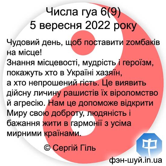 Числа гуа 6(9) 5 вересня 2022 року Чудовий день, щоб поставити zомбаків на місце! Застосування знань особливості місцевості й ландшафту, прояв мудрості й героїзму, покаже хто в Україні хазяїн, а хто непрошений гість. Це виявить дійсну личину рашистов і продемонструє їхнє віроломство й агресію Нам це допоможе відкрити Миру свою доброту, людяність і бажання жити в гармонії з усіма мирними країнами Майстерність – краща реклама! Сприятливий день, щоб переконатися у своїх знаннях, довести свій професіоналізм, майстерність, мудрість. Відстоюйте свої погляди, керуйте своїм життям, а якщо треба й навколишніми Успіхи цього дня вкладайте у творчість, спілкування з навколишніми, репутацію, демонстрацію своїх здатностей, імідж, презентації й рекламу. © Сергій Гіль https://www.фен-шуй.in.ua/cgi-bin/main.cgi?esse=1312 #вільна_Україна #відсіч_рашистам #український_народ #розбити_zомбаків #україна_вільна #Сергіій_Гіль_фэншуй #число_гуа_директор #мудрість #фен_шуй_бацзы #число_фэншуй_шість