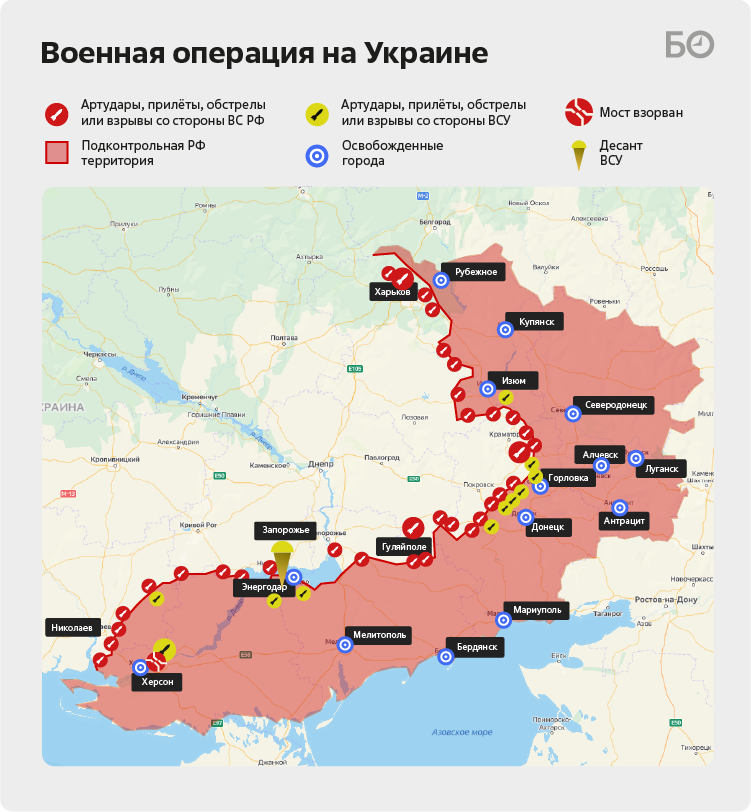 Как обычно напомним, что сражения идут от взаимных перестрелок под Харьковом на северо-востоке, через Донбасс, который на этой неделе отошел на второй план, далее через Запорожскую область и по Днепру до Херсона, где и состоялись основные боевые действия. Длина фронта превышает 500 километров.