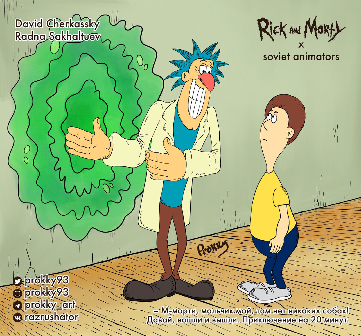Когда две популярные тематики смешиваются в одну - аудитория начинает сходить с ума. Отсюда, к примеру, и популярность разных кроссоверов и киновселенных: увидеть любимых персонажей из разных фильмов плечом к плечу - это всегда захватывающее зрелище. А еще интересно бывает взглянуть на известных персонажей под другим углом: взять хотя бы мультипликационных героев - обычно у них есть узнаваемый визуальный стиль, но что, если взять и нарисовать их в стилистике других анимационных историй? Именно этим и занялся герой сегодняшней статьи - он берет популярных современных персонажей и рисует их в стиле советской анимации. Получается очень здорово. 4 сентября 2022 года, в день премьеры шестого сезона мультсериала «Рик и Морти» в сети появились иллюстрации, на которых главные герои упомянутого шоу были нарисованы в стилистике советской анимации. Нарисовал их российский художник, известный в сети под псевдонимом Prokky, а посты в соцсетях (например в группе ВКонтакте) с теми самыми картинками о