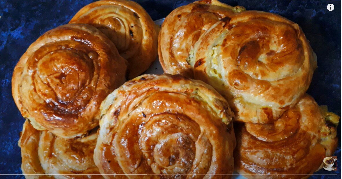 Знаменитый, старый, проверенный временем рецепт готовится легко, просто, получается очень вкусно. Тесто готовим из мука вода и соль делим на 5 частей, немного раскатать диаметром 15 - 20 см и оставить на 10 минут в масле как показано на видео рецепте. Начинка любая, у нас картофельное пюре с сыром и зелёным луком. Тесто очень хорошо и тонко вытягивается как паутинка, складываем с одного края и помещаем начинку, заворачиваем очень слабо в рулет и складываем в три раза как на видео, аналогично со всеми частями теста, полученную выпечку смазать взбитым желтком и посыпать кунжутные семечки. Посылаем в духовку на 35 - 40 минут при температуре 180 градусов, после чего мы получаем слоистую и хрустящую выпечку и чтобы она стала мягкой, оставить под салфеткой на 15 - 20 минут и к чаю наша выпечка готова. Приятного аппетита