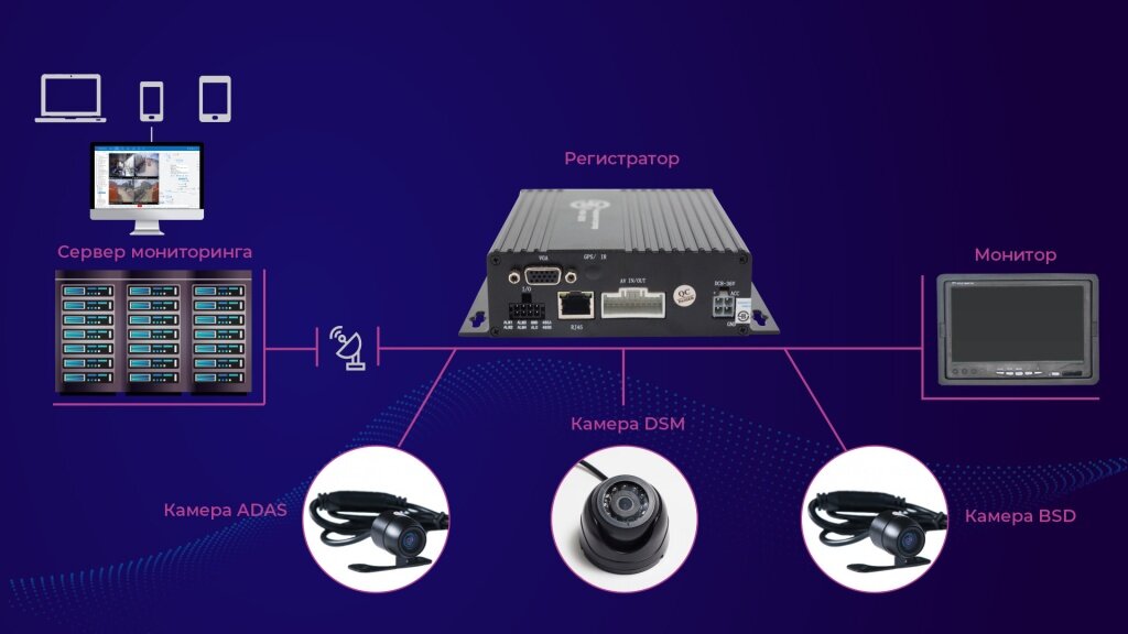 Камера, обращенная к водителю, фиксирует и передает через универсальный регистратор информацию о негативном поведении водителя сначала на сервер мониторинга, а потом диспетчеру. Сервер и регистратор записывают эту информацию. А водитель получает предупреждение о своем опасном поведении в виде видео и звукового сигнала. Камера системы способна распознавать ненормальное поведение водителя: отвлеченное вождение, усталость, курение, телефонные разговоры и закрытие камеры.
