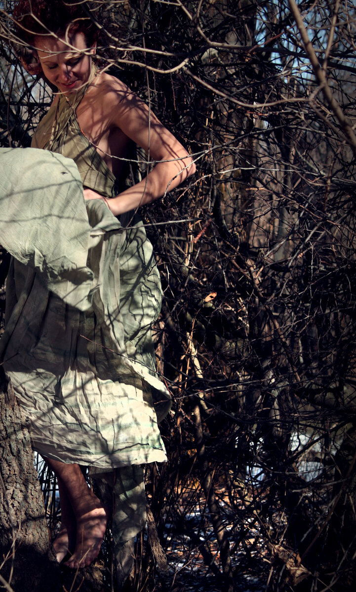 Очень благодарна своим друзьям. Уже давно с ними не общалась – переезд, семья, маленькие дети… Но я часто вспоминаю то время, когда мы общались. Любая сумасшедшая идея подхватывалась моментально и претворялась в жизнь. Задумала однажды фотосессию с названием «За минуту до весны». По названию понятно, что было холодно, съёмка должна была проходить на улице. Сценарий такой - души деревьев просыпаются, чувствуя приближения тепла. Всю ночь я готовила платья. Сшивала всё сразу на моделях. моделями были мои подруги. Делала им причёски и макияж. Фотографировать нужно было утром, чтобы был иней. Утром, красавицы модели быстренько выбегали в костюмах, с причёсками из мастерской, и рассаживались по машинам. Всё действо должно было проходить в очень красивом месте, в барском саду села под названием Вешаловка. Там где было поместье Татищевых. От него осталась одна башня, церковь и склеп. Но сад, даже в таком заброшенном состоянии был прекрасен! Это одно из моих любимых мест. Туда мы и рванули. Ут