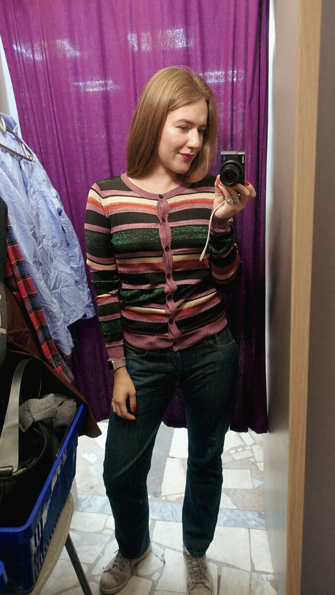🍁Кардиган на пуговицах в полоску, нравится сочетание цветов и зелёного люрекса, малообъемный, я хочу его сочетать с платьем-сарафаном от H&M, которое купила не так давно, найти его можно здесь↙️