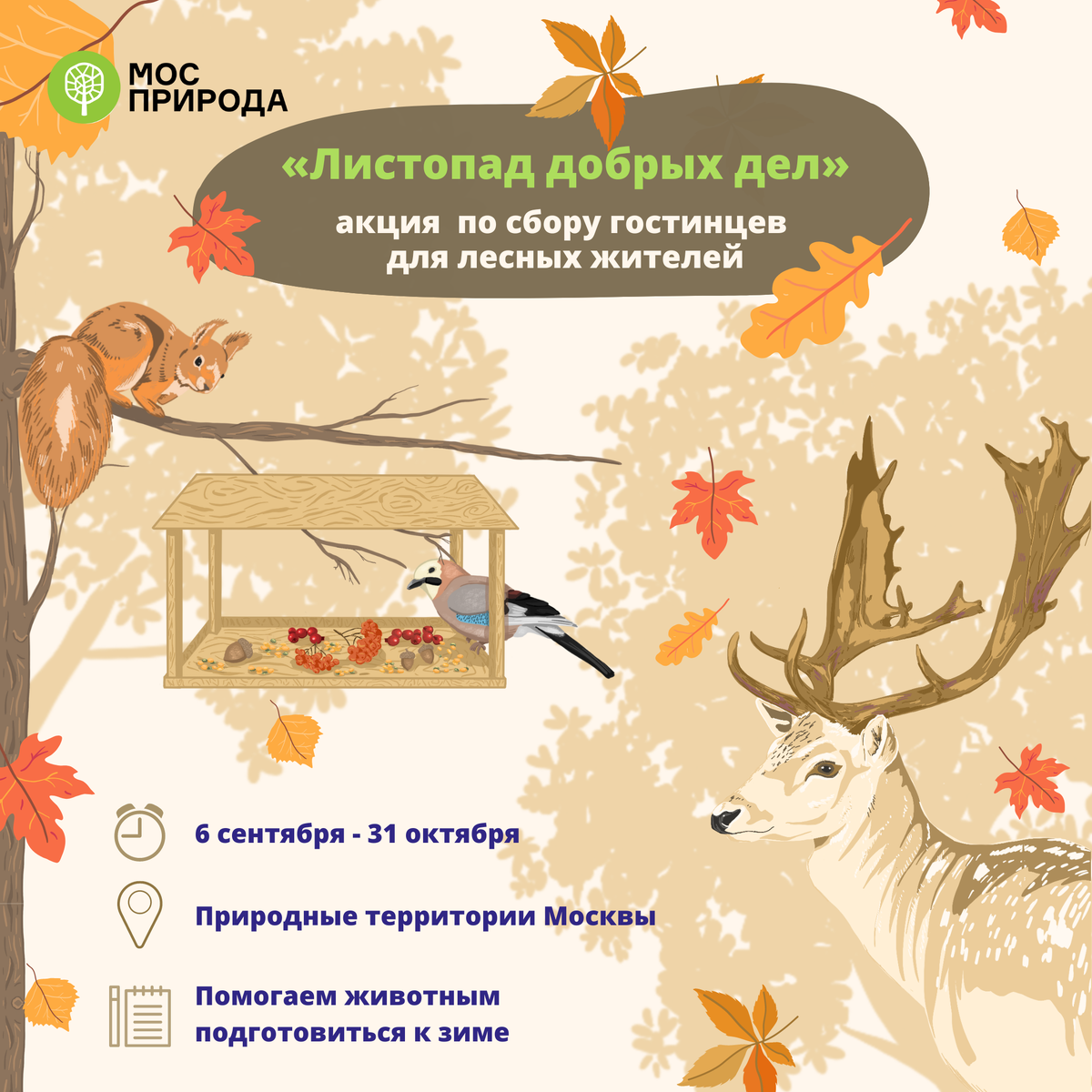 Специалисты Мосприроды объявляют о старте акции «Листопад добрых дел», организованной в помощь птицам и зверям, которые начали готовиться к зиме. Участникам предлагается помочь отремонтировать или смастерить и развесить кормушки, искусственные гнездовья, подготовить запасы гостинцев для подкормки животных зимой.
