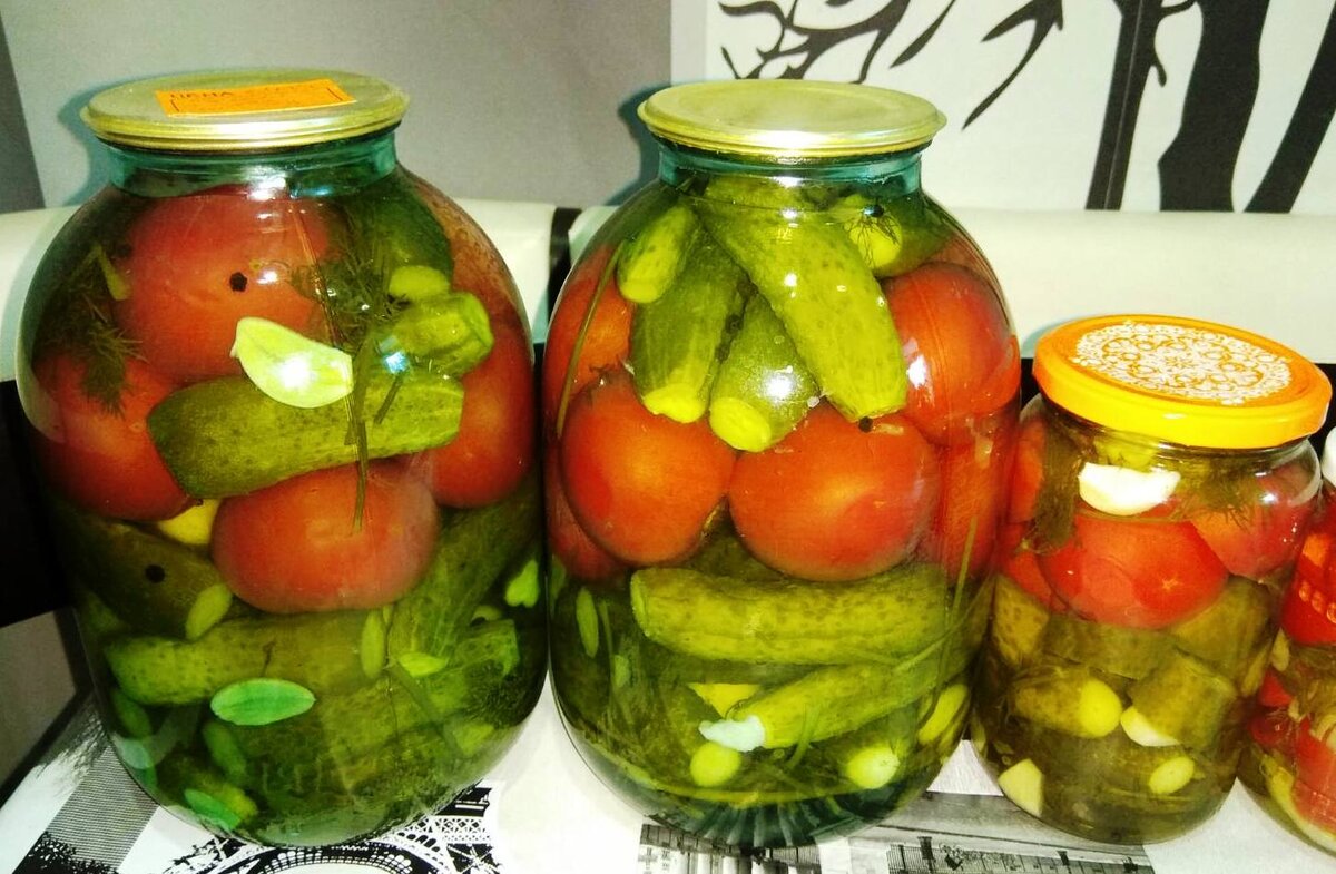 Незаметно постепенно зимние запасы разрастаются. Совершенно не устаешь, вроде делаешь всего понемногу, а полки стремительно заполняются. По 1-2 банки в день. Размер банок выбирайте сами. Когда остаются разные овощи, экспериментирую с разными ассорти. Сегодня будут чистые помидоры и огурцы. Классика.Плюс перец болгарский, морковь, цветная капуста и яблоки - это уже другая история. Нам понадобится: 1 кг огурцов 1 кг томатов 2-3 зонтика укропа 10 зубчиков чеснока 10 горошин черного перца 3 ст. ложки соли без горки 3 ст. ложки сахара с горкой 100 мл уксуса 9% 1500 мл воды Вот баночка, закатанная прямо на даче Главное, не забыть перед этим, обязательно замочить огурчики на 2 часа Помидоры проткнуть зубочисткой В стерильную банку кладем 4 зубчика чеснока, 5 горошин перца Уложить огурцы Добавить сверху еще 3 зубчика чеснока Затем положить помидоры Опять чеснок – 3 зубчика и перец Сверху зонтик укропа Приступаем к процессу: Заливаем овощи кипятком на 30 минут. Прикрываем крышкой. Сливаем воду