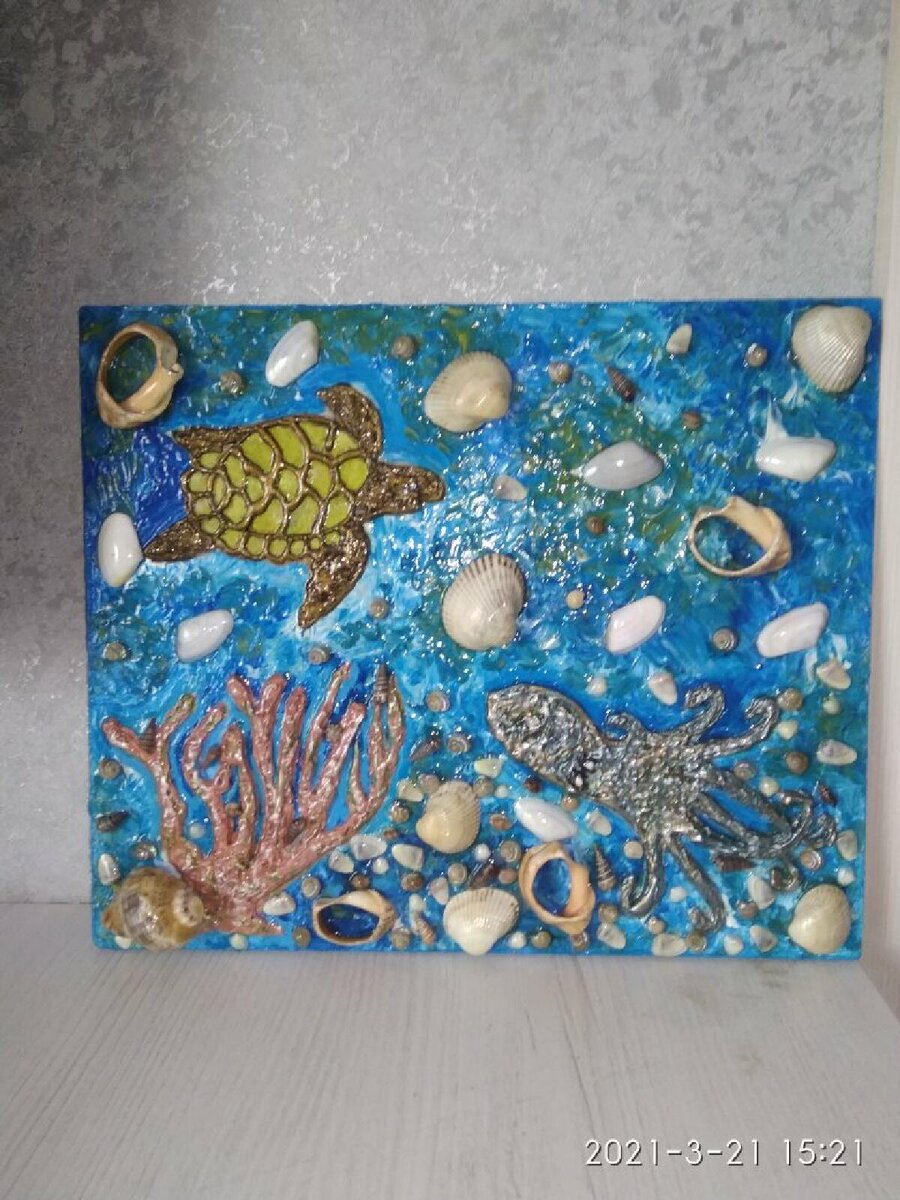 7Доброго времени суток,кто зашел ко мне в гости.На улице похолодало и хочется еще немного лета.Поэтому сегодня у меня будет обзор моих некоторых работ на летнюю тематику.Как я писала ранее,очень люблю работать с природным материалом.Сегодня у меня камешки и ракушки.Картины в смешаной технике,делала для себя.Возникла необходимость такая когда решила приобразить мой новый дом.Все что служит украшением моего дома,не покупаю никогда.Мне гораздо приятнее находится в доме среди вещей,сделаных моими руками,нежели что нибудь купить.Некоторые люди называют это пылесборниками или еще как то.Но это мои умозаключения ,и в этом вопросе меня не переубедить. У меня в доме,так получилось,очень длинный коридор,аж 7 метров,и что бы он не казался скучным,я решила его преобразить в морскую тематику.Поэтому в ход пошли мои картины в морском стиле.Сегодня покажу некоторые из них Эта картина выполнена клеевым пистолетом,с использованием ракушек,называется "на дне морском".