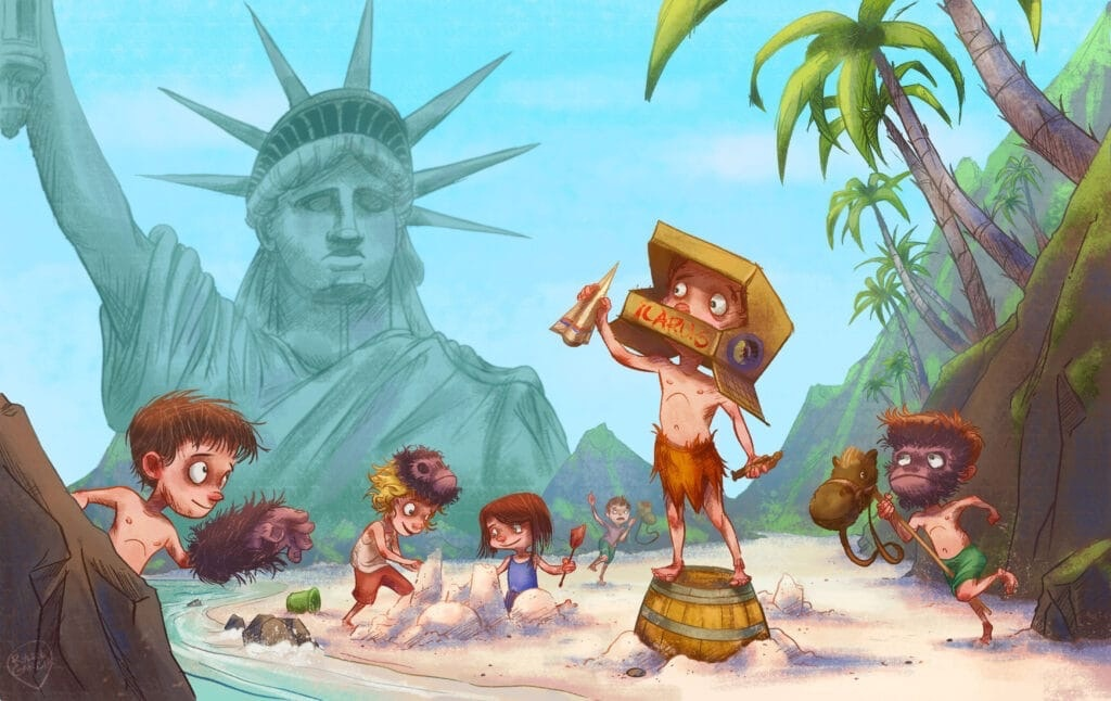 Большое количество элементов направляет взгляд зрителя на мальчика на бочке: он находится в области фокуса внимания. Жест статуи Свободы находит своё отражение в жесте мальчика. Он стоит на бочке, поэтому контрастирует с другими детьми, играющими на песке. Пальмы и окружающая среда создают V-образную форму, действующую как композиционный указатель. Кроме того, с помощью окружающей среды и объектов я стремился добавить в композицию как можно больше ритма и динамики.