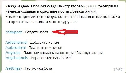 Для создания своих постов необходимо создать свой бот. Делаем это в боте @ControllerBot, который после запуска при нажатии на кнопку – создать пост, потребует добавить свой канал, который вы создаете в настройках своего профиля. После этого, @ControllerBot предложит вам создать своего бота и прислать его токен. Бот создается в @BotFather, где вы нажимаете на кнопку - /newbot - create a new bot @BotFather выдаст вам такое сообщение Что в переводе означает: Хорошо, новый бот. Как мы собираемся это назвать? Пожалуйста, выберите имя для своего бота. Придумываем название, например, - Мои посты и отправляем в бот. Бот попросит Перевод: Хорошо. Теперь давайте выберем имя пользователя для вашего бота. Оно должно заканчиваться на `бот`. Вот так, например: Tetris Bot или tetris_bot. Я напишу moipost_bot и отправлю в бот Не захотел @BotFather принять это имя, так как такое уже есть. Извините, это имя пользователя уже занято. Пожалуйста, попробуйте что-нибудь другое. Добавим какие-нибудь цифры в и